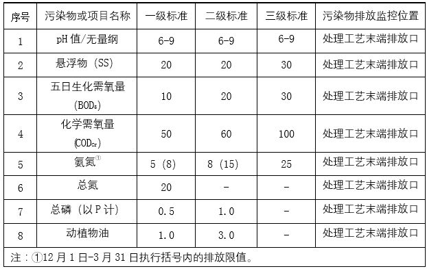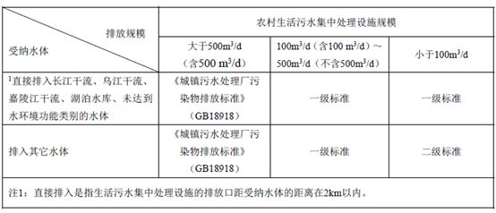 出水排入其它水體的處理設施執行二級標準。其中,規模大于50m3/d(含)的處理設施執行A標準,規模在50m3/d(不含)-5m3/d(含)的處理設施執行B標準。