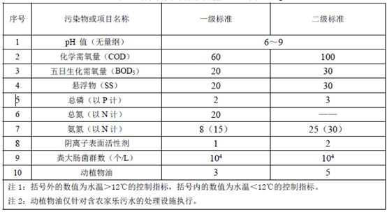 ◆ 根據受納水體的水域功能與排放規模等,將農村生活污水集中處理后水污染物排放標準值分為一級標準、二級標準,各標準適用情況及水污染物最高允許排放濃度限值見下表。