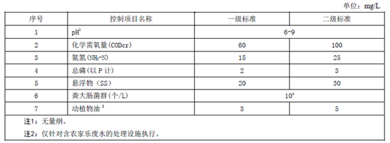 2015年7月,浙江《農村生活污水處理設施水污染物排放標準》發布實施,規定農村生活污水排放必須達到規定的排放標準。《標準》確定了pH值、化學需氧量、氨氮、總磷、懸浮物、糞大腸菌群、動植物油等7項主要控制指標及限值,詳情如下:
