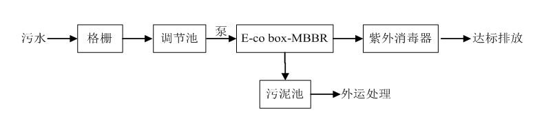 本項目污水來源主要為生活污水和收集的初期雨水。污水中污染物主要以有機物、氨氮、磷和懸浮物為主。結合相關工程實踐經驗和國內同類工程的比較,針對該污水水質、水量特點,從工程的可靠性和設計的合理性出發,本方案擬采用鵬凱箱“E-co box-MBR”一體化污水處理設備對該污水進行處理。工藝流程如下所示: