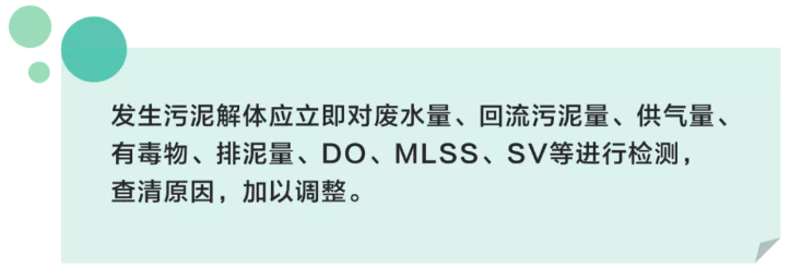 當污泥處理系統出現處理水質渾濁、污泥絮凝體細化、處理效果變壞時,即為污泥解體現象。可能是運行不當,曝氣過量,營養平衡遭破壞或是廢水混入有毒物質使微生物受到傷害而引起污泥解體。