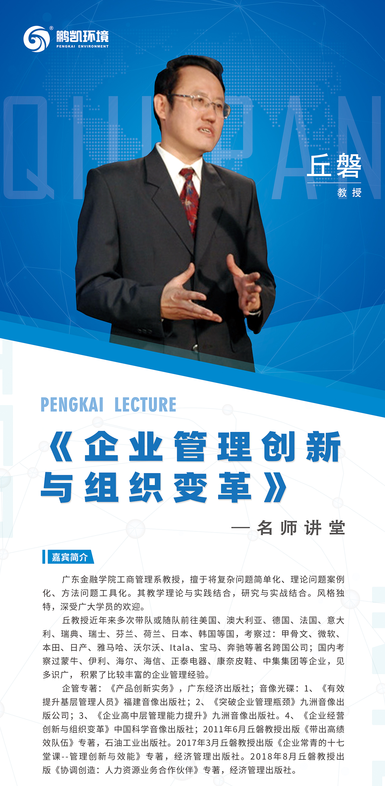 為提高企業管理創新實效,激活各級管理人員創新活力,提高核心競爭力,進一步推進鵬凱環境落實戰略部署,實現高質量發展,鵬凱環境特組織舉辦《企業管理創新與組織變革》內部培訓。鵬凱環境董事長王國彬、常務副總經理潘泉率公司團隊參加培訓。