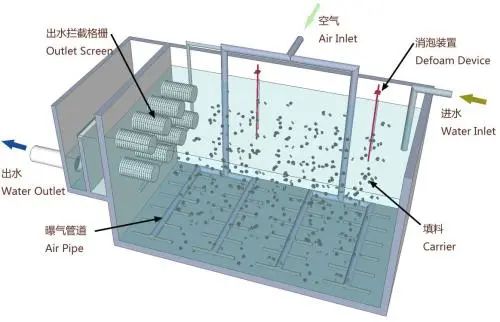 MBBR工藝是運用生物膜法的基本原理,通過向反應器中投加一定數量的懸浮載體,提高反應器中的生物量及生物種類,從而提高反應器的處理效率。由于填料密度接近于水,所以在曝氣的時候,與水呈完全混合狀態,微生物生長的環境為氣、液、固三相。