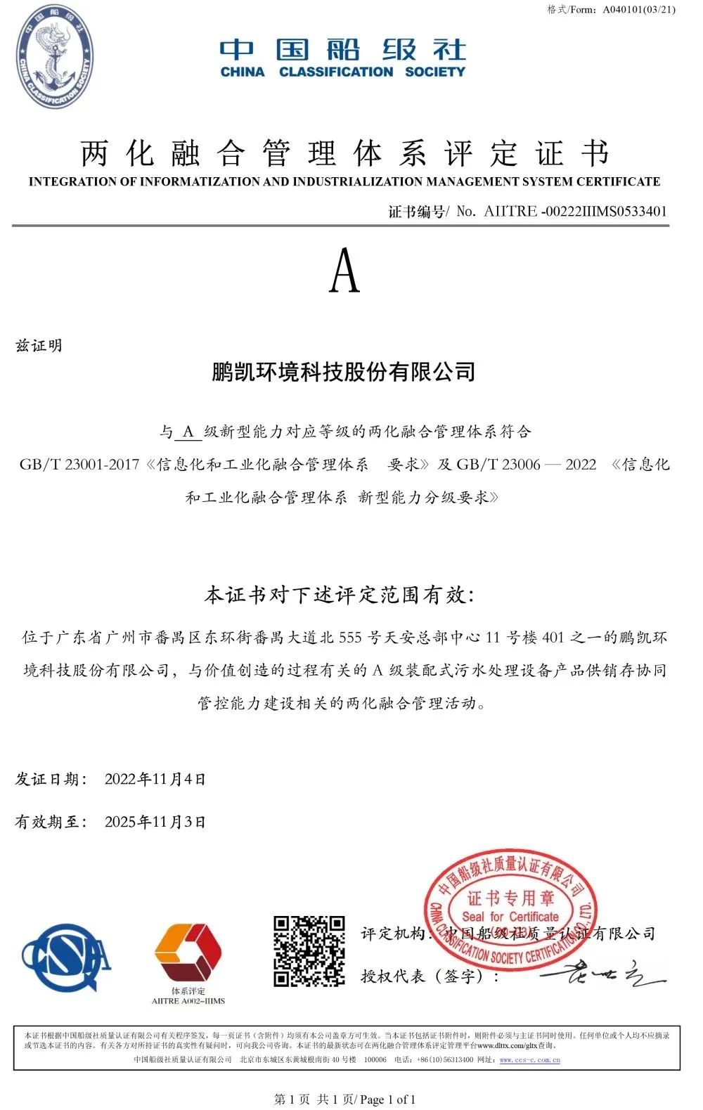 近日,鵬凱環(huán)境喜獲《兩化融合管理體系評定證書》,這是鵬凱環(huán)境走新型工業(yè)化道路,積極推動(dòng)工業(yè)化與信息化高層次深度結(jié)合,持續(xù)促進(jìn)兩化融合的重要成果。