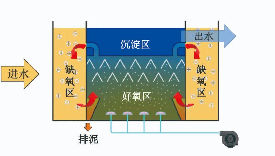 高效節能模塊裝配式污水處理系統主體設備為多級環狀結構,池體內通過鋼結構壁板分隔出內圈和外圈兩個主體部分。外圈設有曝氣組件和推流裝置,通討精準曝氣調控外圍的厭氧區、缺氧區和好氧區:內圈通過三相分離器將沉淀區和好氧區各加,形成好氧沉淀區,取代傳統的二沉池。在好氧沉淀區中,三相分離器實現氣、水、污泥的有效分離,污水進入深度處理單元;氣體由集氣罩收集后形成 廠項目,處理規氣提,帶動混合液回流。