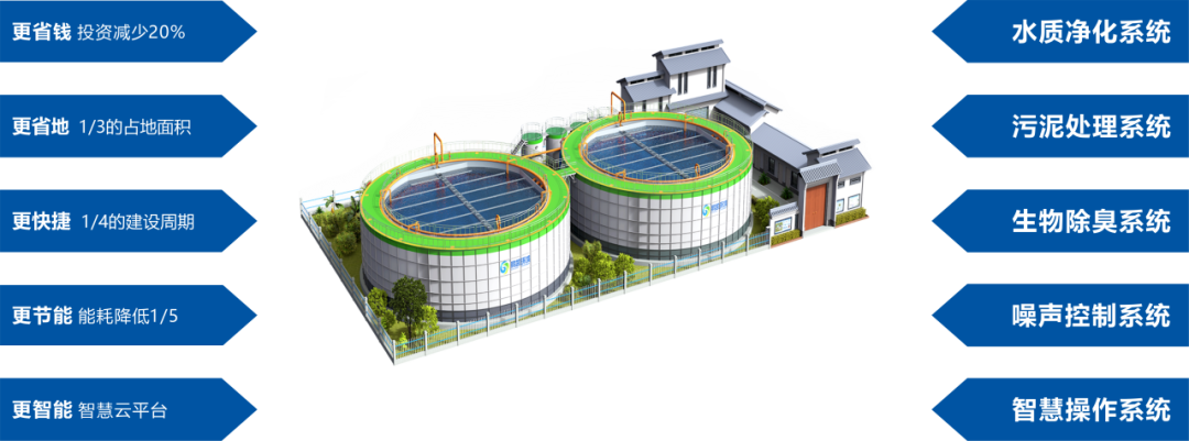 通過生化反應高效去除水體中COD、NH3-N、TP、TN、SS等污染物,使出水達標排放。主要附屬設施包括“污泥壓縮加壓泥系統”、“加藥系統”等。在穩定運行條件下污泥濃度提高至5.0g/L- 10.0g/L,沉淀區表面負荷1.5m3/( m2h )- 2.5m3/( m2h )。使用該技術搭建的裝配式廠對比傳統污水廠具有處理效率高、能耗低、占地省、建設周期短等特點。