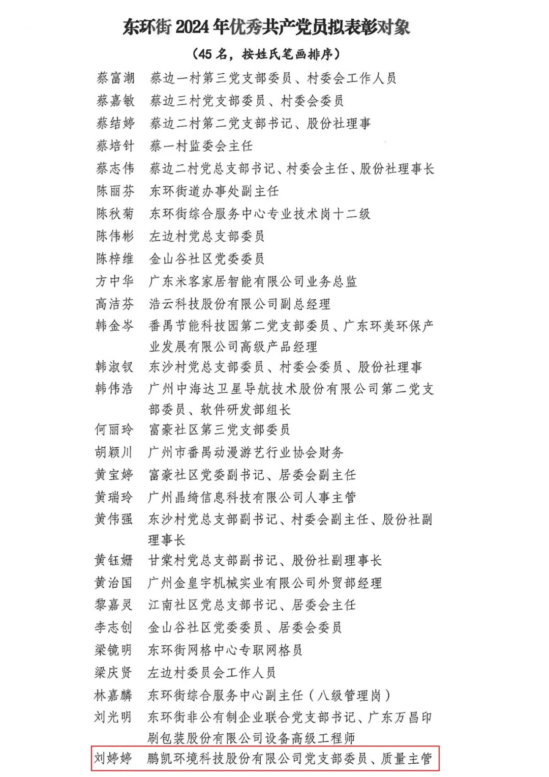一、 中共鵬凱環境科技股份有限公司支部委員會被評為廣州市番禺區東環街先進基層黨組織。趙亞同志榮獲東環街 2024 年“兩優一先”優秀黨務工作者稱號,劉婷婷同志獲得東環街 2024 年“兩優一先”優秀共產黨員稱號。