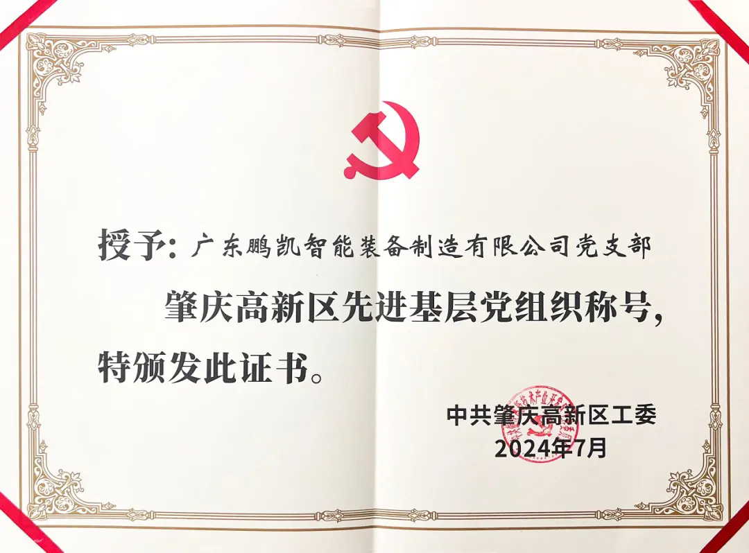 二、 中共廣東鵬凱智能裝備制造有限公司支部委員會被評為廣東省肇慶市高新區先進基層黨組織。
