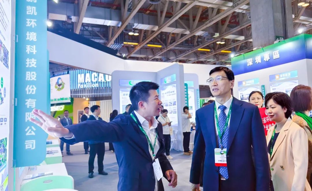 展會首日,廣東省人民政府副省長、副總林長張少康,廣東省人民政府副秘書長劉華偉,廣東省生態環境廳黨組書記、廳長徐曉霞,廣東省生態環境廳副廳長羅世衍,廣東省生態環境廳二級巡視員許金洲,廣州市生態環境局黨組書記、局長王保森,廣州市生態環境局黨組成員、副局長李新科,中國環境保護產業協會黨委書記、會長郭承站,廣東省環境保護產業協會會長麥建波等領導先后親臨鵬凱環境展位考察指導。鵬凱環境董事長兼總裁王國彬向巡展領導就我司生產經營狀況,以及在低碳治水技術創新與轉化應用情況作了詳細匯報。