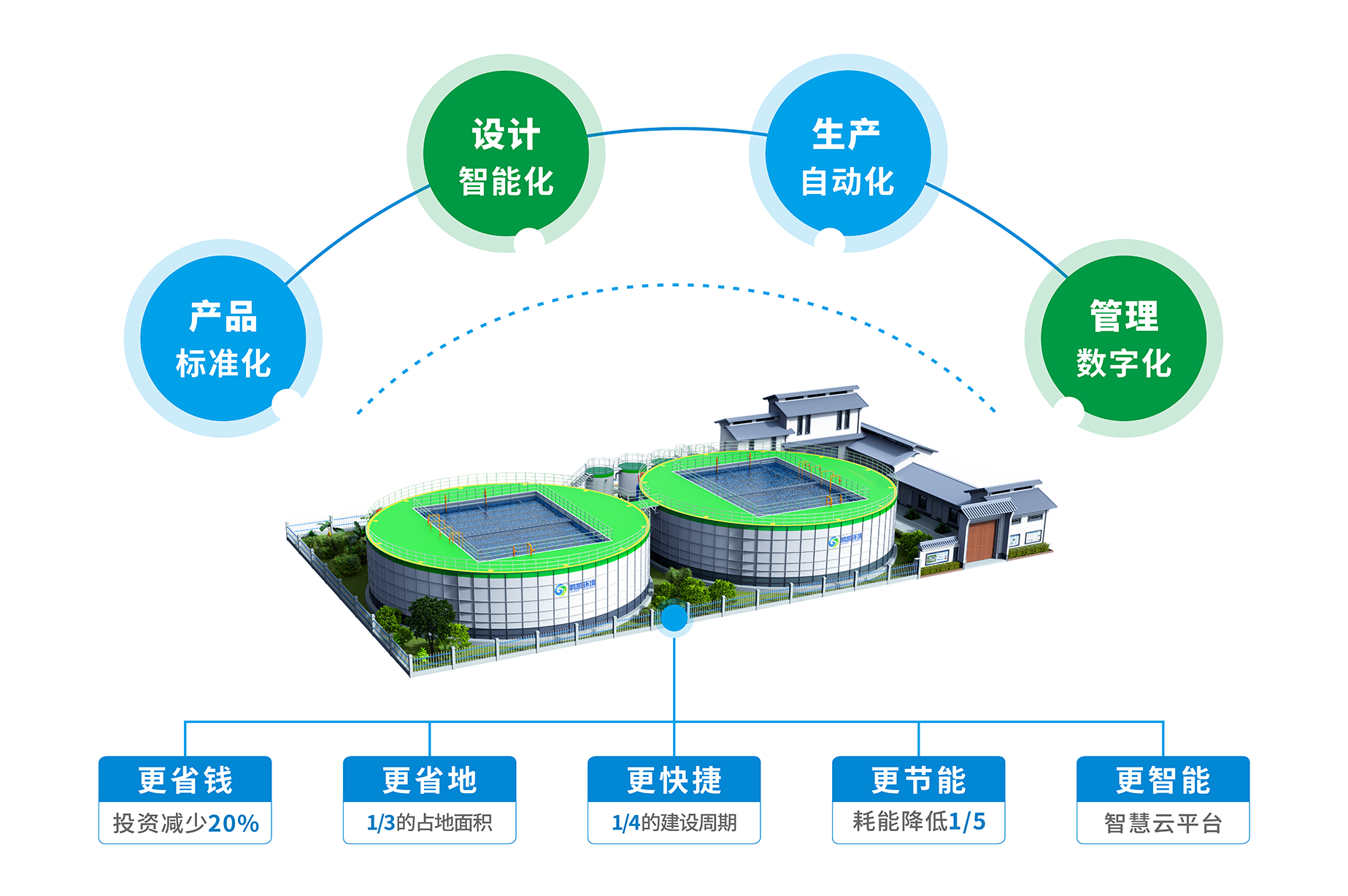 鵬凱環境以“工程設備化、設備標準化、運維智能化”為設計理念,創新性研發出鵬凱圓一低碳高效裝配式污水廠(DIAB高效氣升環流式脫氮生物反應器),開啟工廠化預制污水處理系統新模式,為環保產業高質量發展提供了可復制的“技術產品化”解決方案。