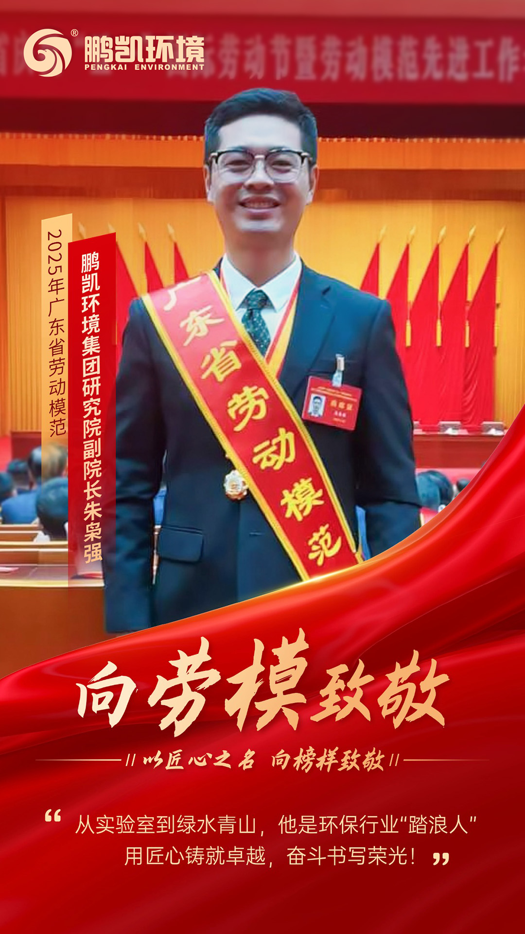 4月29日上午,2025年廣東省慶祝“五一”國際勞動節暨勞動模范、先進工作者和先進集體表彰大會在廣州舉行。鵬凱環境集團研究院副院長朱梟強博士榮獲“廣東省勞動模范”榮譽稱號。